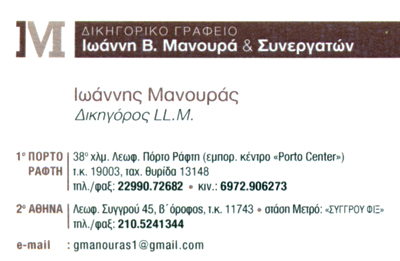 Λέξεις Κλειδιά: Γιάννης Μανουράς, και Ιωάννης Μανουράς, Δικηγόρος, Δικηγορικό γραφείο, Νομικές υπηρεσίες, Πόρτο Ράφτη, Μαρκόπουλο, Κερατέα, Κορωπί, Καλύβια,Μεσόγεια, Νομικές Συμβουλές, Δικαστήριο, Ειρηνοδικείο, Πρωτοδικείο,Αστικό Δίκαιο, Διαζύγιο, Οικογενειακό Δίκαιο, Εμπορικό Δίκαιο, Δίκαιο Ανώνυμης Εταιρίας, Κατοχύρωση Σημάτων, Ευρεσιτεχνιά, Δίκαιο Ανταγωνισμού, Διοικητικό Δίκαιο, Πτωχευτικό Δίκαιο, Σύσταση και λειτουργία Εταιριών,